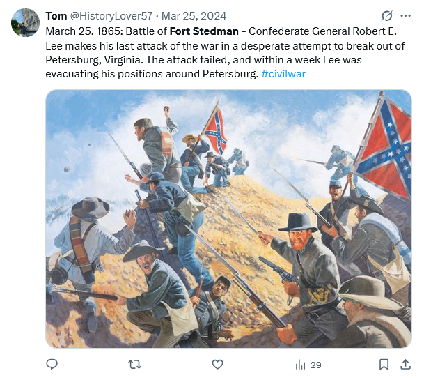 Few generals in American history have been as aggressive as Robert E. Lee.  Faced with a hopeless military situation in March of 1865, he decided that he had no alternative but to launch an attack.  His starving army was down to 50,000 men, and with the lines around Petersburg and Richmond so extensive, when Grant began to move with an army nearly three times the size of Lee’s it did not take a military genius to realize that he would break Lee’s lines.  However, if Lee could break Grant’s lines first, it might buy Lee time.  Grant would perhaps consolidate his lines around the breakthrough and delay his Spring offensive.  That might give General Joseph E. Johnston sufficient time to march up ahead of Sherman from North Carolina and link up with Lee.  At that time Lee could attempt to defeat Sherman and then Grant seriatim.  The plan relied far too much on hopes and wishes, but other than surrender, it was the best of the bleak options facing Lee.