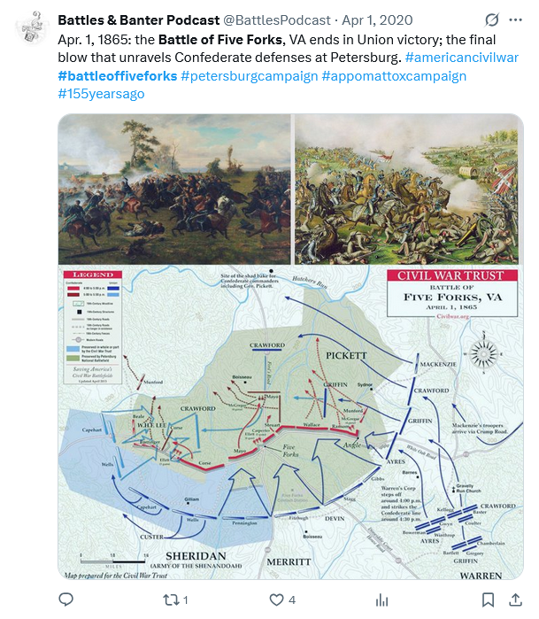 On March 31, 1865 General Pickett, commander of the Confederate forces at Five Forks, had launched an attack on Sheridan’s troopers driving them south to just north of Dinwiddie Court House. However, his left flank being threatened by troops of the V Corps arriving to reinforce Sheridan, Pickett retreated to Five Forks. Sheridan followed the retreating Pickett, and launched an attack on the Confederate breastworks at 1:00 PM on April 1, with two divisions of dismounted Union cavalry, armed with Sharps repeating rifles. This intense fire pinned down the Confederates while the infantry of the V Corps massed to attack the Confederate left. At 4:15 the attack went in , overcoming a stubborn Confederate defense. Sheridan removed General Warren from command of the V Corps on the grounds of being dilatory in arranging the attack of the V Corps, a decision which was ruled unfounded by an Army court of inquiry in 1883. Confederate casualties were almost 3,000 many of them prisoners, and Union casualties were 830. The Confederate right had now been turned, and largely obliterated, and the  Southside Railroad lay exposed to the Union. Richmond and Petersburg could no longer be held.