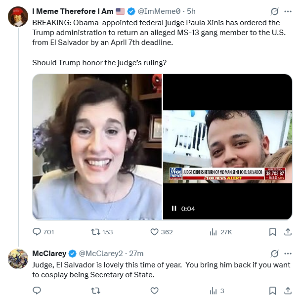 Let the MS-13 return only if Judge Xinis keeps them in her house under house arrest. What is fair for me is fair for her.