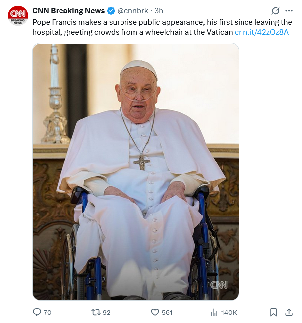 It appears that Pope Francis has lost sight in his left eye. The byline was dated Apr 6 in the article I read. It was noted that he has limited movement of his arms which happened before the pneumonia; speech therapy continues along with physical therapy. Francis is still being treated for a lung infection. He is being slowing weaned from the oxygen tubes.