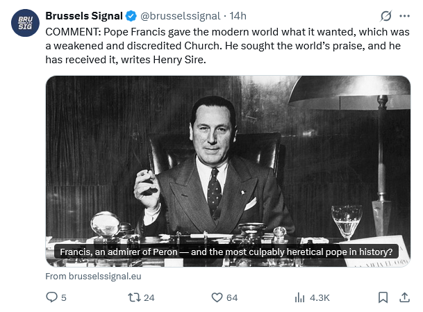 Go here to read the rest. The Peronist Pope damaged the Church in ways that will take years if not decades to repair. The Conclave of 2025 will go down in history as beginning the work of repair, or continuing the destructive legacy of Pope Peron Francis.