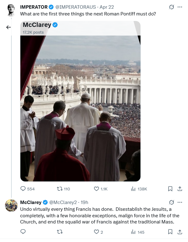 2). As Don said, end Francis’ squalid war against the Traditional Mass. And not just by abrogating the deeply unjust Traditiones Custodes and reinstating Summorum Pontificum, but also by ordaining FSSP, ICKSP, and yes, SSPX bishops. I cannot understand why Francis thought it was fine for the Communist Chinese government to decide who can be a bishop, and loopy Jesuits can have them, yet tradition-loving Catholic orders must be kept at the mercy of often hostile ordinaries.