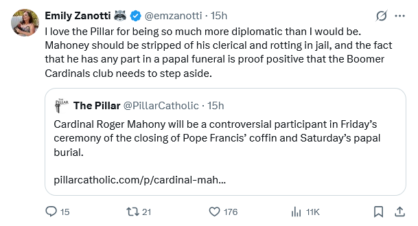 If you’re paying attention, the funeral preparation and liturgies exposed the corruption of the current leadership in the Vatican. Cardinal Mahoney having a public role? Tells you all you need to know and I pray it’s not an indication of what’s coming out of the conclave.