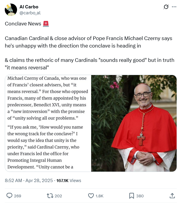 I think any Cardinal Elector paying attention should see that whatever Francis’ legacy might be, it increasingly appears to have been built on sand. I certainly hope the Cardinals consensus is that it will be pointless to double down on what seems to have been a pontificate of chaos and failure.