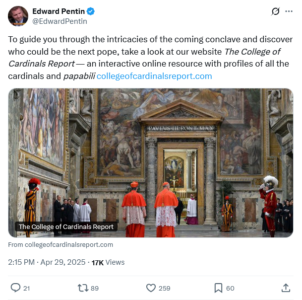 […] Analysis, Punditry, and News:Perpetual Eucharistic Adoration Live – Big PulpitConclave Watch: The College of Cardinals Report – Edward Pentin via the American CatholicIt’s Here! The 2025 Color of the Year – […]