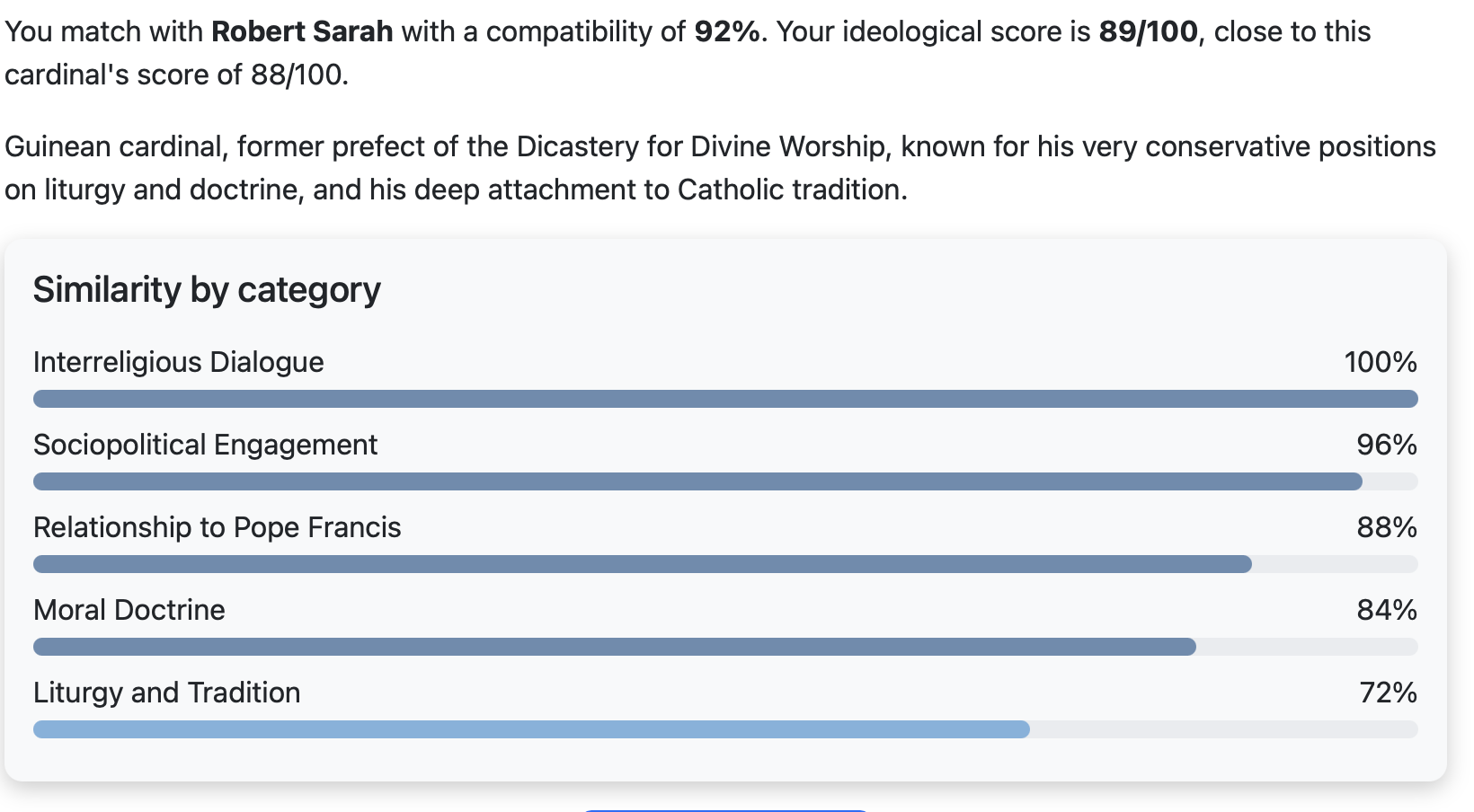 Interesting. I matched equally with Nurke, Muller, and Sarah – differing on the possibility of divoece and priestly celinacy, both of which are relatively minor issues to me, and which might be expected from a stidgy conservative Anglican with one foot in an Eastern Catholic (i.e.priestly celubcy optional) church. I just want tto be able to go back to using the phrase, “Is the pope Catholic?”