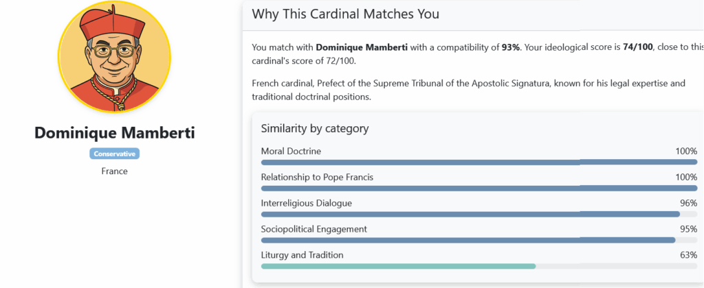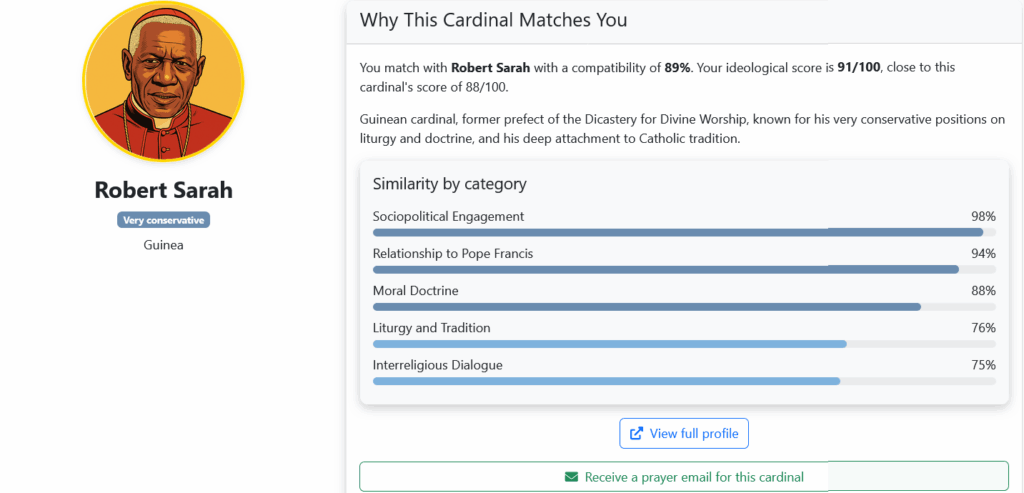 I took it twice (different emails) and got Cardinal Burke each time…My personal favorite is Cardinal Sarah.