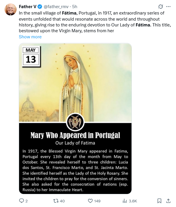 Indeed F7. We speak of the Miracle of the Sun but sometimes I wonder if it was not the Miracle of the Son, with the Transfigured Christ appearing to them very high up in the sky. Witnesses as far afield as the Canary Islands saw it.