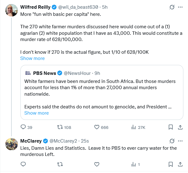 Back to the point, how absurd is the reasoning of PBS News. Even if murdered white farmers accounted for 1 murder, let alone 1% of murders, then that is 1 too many murdered. Are not all lives equal and valuable? Obviously, murdered white farmers are just statistics to PBS News. Imagine substituting the word “white” for “black” and the outrage that would unfold.