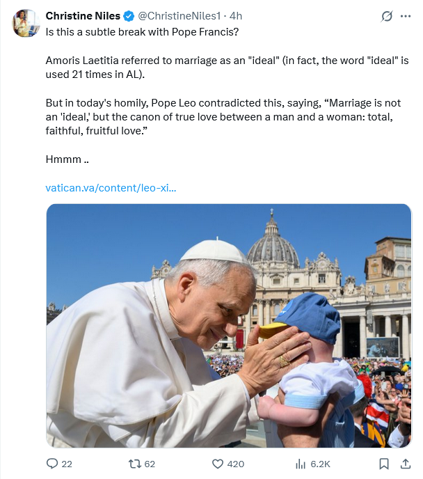 My outlook is that I will give Leo XIV a break. He is surrounded by people whose only competency was that they obeyed Bergoglio. I have been, more often than not, a failure at running a Catholic household. He is the spiritual leader of over a billion souls and he has been at it for a month.