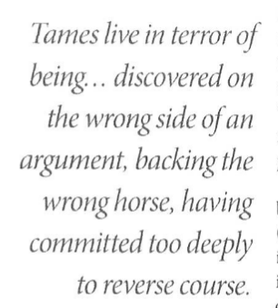 Tameness seems to be the perversion of the Paulist principle to be all things to all people. Paul did so that *Christ* might be served. Tames seem to do so that their peace or peace in general might be preserved.