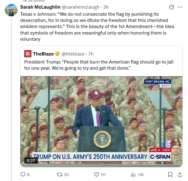 Texas v. Johnson (1989), is a 5-4 decision that crossed ideological lines, in which the Supreme Court found unconstitutional all anti-flag desecration laws. The decision was a particularly silly example of a trend in the Court of confusing conduct and speech, and thus finding an action which is not speech worthy of first amendment protection. The lunacy of this is that almost all conduct carries a speech component. The Court picks and chooses the conduct it wishes to enshroud in constitutional protection. Walking nude in public for example can be a form of protest. Indeed, a group of Quaker women in colonial Boston engaged in a naked promenade to protest Puritan persecution of the Society of Friends. Yet, the Supreme Court has declined to strike down laws that ban public nudity. The Court thus designates itself the arbiter of what conduct should have legal protection. I prefer that such a role be granted to legislatures. Legislators can be voted out. Supreme Court justices are frequently with us for generations as they grow old handing down the law to we lesser breeds. Besides, it is easy to change the law, and hard to amend the Constitution, unless one happens to be one of our nine Platonic Guardians. The Supreme Court, in effect, swiftly amends the Constitution each year by majority vote of the Court and the rest of us are left to deal with freedoms often infringed as a result, especially our most important freedom: the right to rule ourselves.