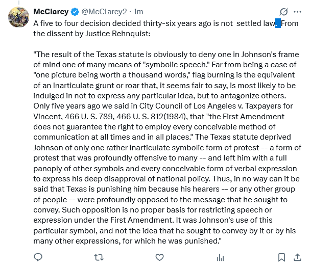 Johnson could have burned his pajamas. The American Flag belongs to all Americans in joint and common tenancy. The American Flag is our property, cloth and all.
