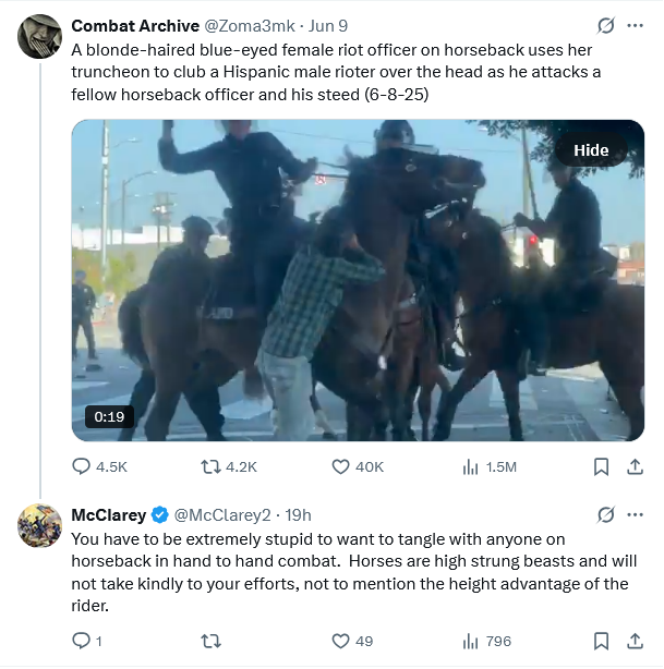 The horse is no longer an animal of war, but in crowd control it can be a valued force multiplier, if the rider is skillful and the protestors are stupid. One of the last successful cavalry charges in war: