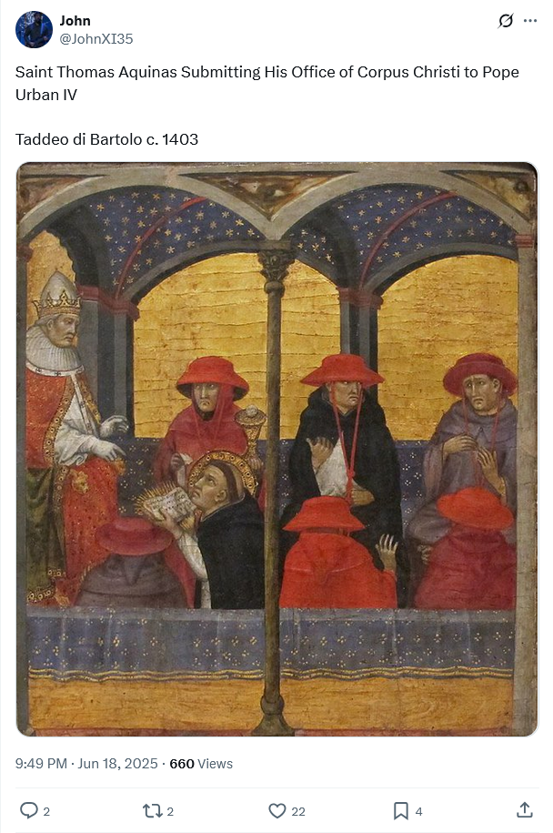 When Corpus Christi rolls around I always think of Saint Thomas Aquinas and his great eucharistic hymn Pange Lingua Gloriosi Corporis Mysterium written by Saint Thomas at the command of Pope Urban IV to celebrate the feast of Corpus Christi instituted by the Pope in 1263. It says something vastly significant about the Church that perhaps the greatest intellect of all time, Saint Thomas Aquinas, was not only a Doctor of the Church, but also capable of writing this magnificent hymn.