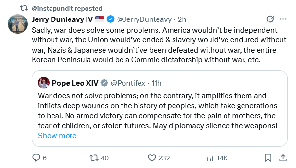The Pope is like a lot of American bishops. He sounds like a randomly selected NGO employee. “War does not solve problems. On the contrary, it amplifies them” is a fatuous statement.