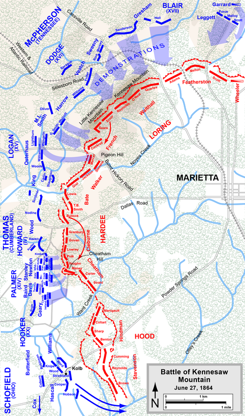 Following the battle of Pickett’s Mill on May 27,1864, the Union and Confederate armies would spend June with Sherman attempting to find some way to outflank or make his way through the defensive lines constructed by Johnston to defend Marietta, Georgia, and his rail supply line.