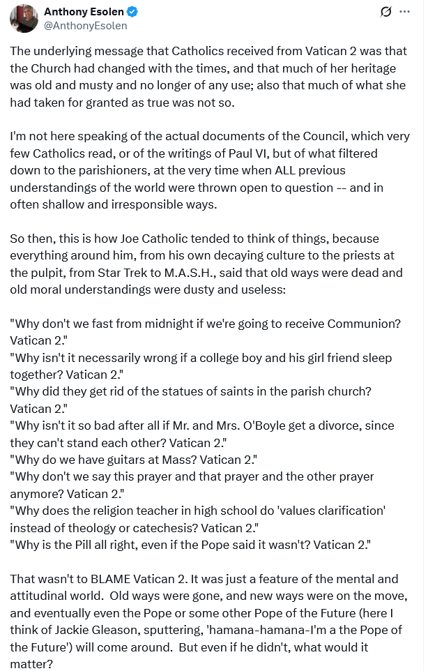 Has any Vatican II document aged worse than “The Church in the Modern World”? It lies tattered and useless with its bland optimism and attitude that all progress will be wonderful. It’s painful to listen to whenever it’s read during the Office of Readings.