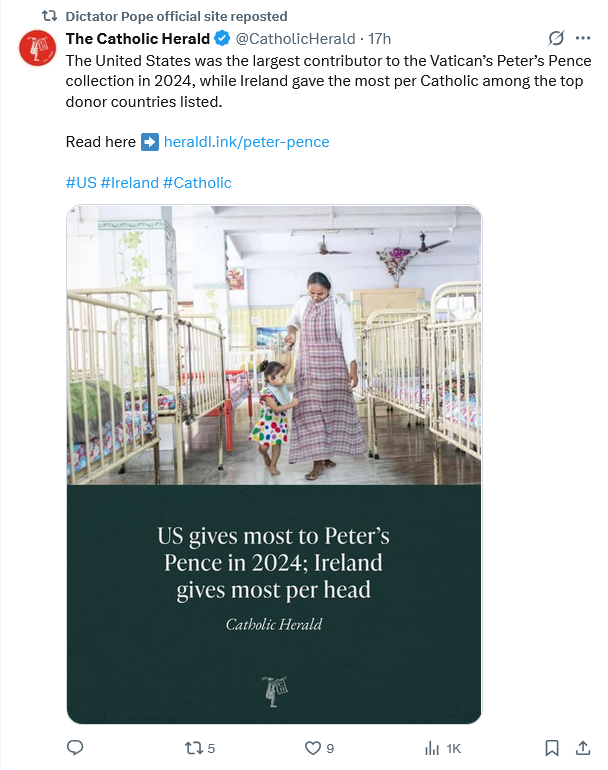 For the first time in a decade last Sunday I contributed to the Peter Pence collection.  Go here to read about the Peter Pence collection in 2024.  A few observations.  The amount of Peter Pence donations dropped the longer that Pope Francis was Pope.  This was not only because of the late Pope’s confusion of Leftism with Catholicism, but also due to the well covered financial scandals at the Vatican.  That the US gives 25 percent of the total is not surprising.  In many Catholic countries the rate of giving for any purpose is pathetic, people expecting the rich or the government to come up with the cash.  For the very poor this is understandable, but this view tends to permeate Catholic societies, to our shame, with the US being a notable exception.  Money from the US has long been the economic life line for an insolvent Vatican.  Putting Vatican finances on a transparent and business like footing should be near the top of Pope Leo’s agenda.