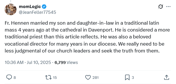 “Regarding Fr. Hennen, he was noted to have been a key contributor to the Diocese of Davenport’s 2023 Guidelines for Pastoral Accompaniment of Sexual and Gender Minorities, a document that appears to speak more about “inclusion” and “listening” than about conversion, repentance, or truth.