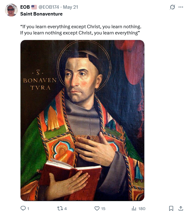 St. Thomas Aquinas coming one day to pay a visit to Saint Bonaventure, asked him in what books he had learned his sacred science. St. Bonaventure, pointing to his crucifix before him, said: “This is the source of all my knowledge. I study only Jesus Christ and him crucified.”