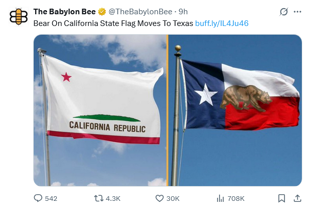 SACRAMENTO, CA — A piece of the Golden State’s heritage was lost today, as the iconic grizzly bear that had adorned the California state flag announced that he had officially moved to Texas.