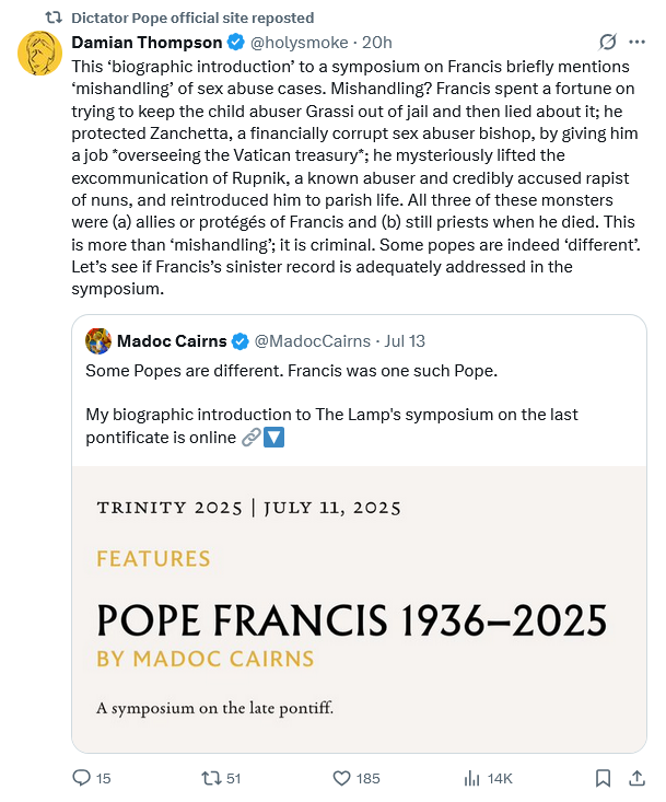 […] Fruit of Vatican II’s Folly:The Lamp Magazine Popesplains Francis – Damian Thompson via The American […]
