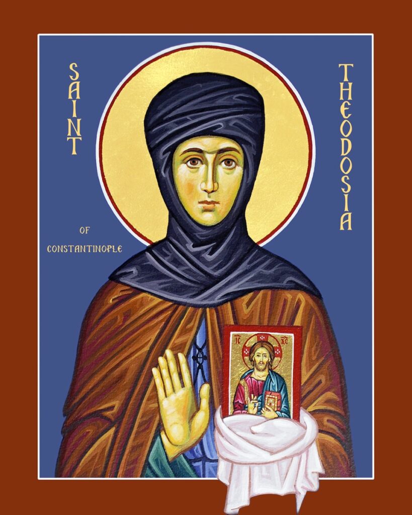 Nun and martyr. Born to a noble family, she was orphaned in her youth and eventually became a nun at Constantinople (modern Istanbul, Turkey) at the monastery of St. Anastasia. She led a group of nuns in defense of the icon of Christ which hung over the main door of the community when soldiers were sent to enforce the decrees of the Iconoclast emperors Leo Ill the Isaurian and Constantine V. Theodosia and twelve other nuns were arrested and tortured; Theodosia died of her grievous injuries while in prison (745). It is possible that the account of Theodosia is fictitious, based perhaps on the story of the fourth-century martyrs Theodora and companions who are venerated on the same feast day.
