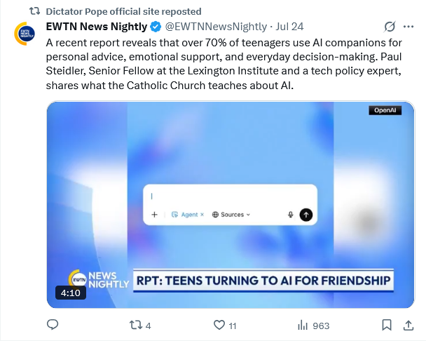 Amen, LQC. Every day I see YT channels purporting to present the words, and sometimes allegedly recorded speeches or homilies, of figures ranging from Popes Leo XIV, Francis, Benedict XVI and JP2, to Padre Pio, Bishop Barron, and various others. Almost all of them are fake, LLM-generated videos designed to exploit the monetization features of the platform. I’m not sure that “AI is going to kill the Internet”, as some of the more excitable types in the wilds of Reddit are saying, but it’s definitely a problem.