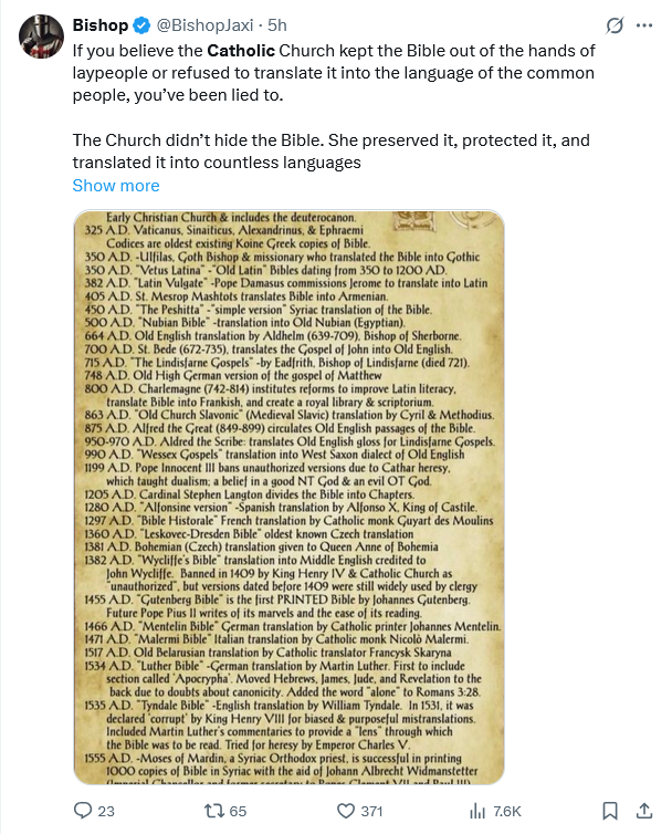 Having been born and raised in the Assemblies of God, I was taught all manner of lies in that denomination. It was actually a relief to learn the Truth: the Church preceded the Bible, and is the foundation of Truth, NOT Scripture. She determined under guidance of the Holy Spirit what Books would be considered Canonical and what would not be in the late 4th century AD. Those Books included the Deuterocanonicals that Protestants rejected on their own authority. And all this nonsense about Renaissance Protestant translations into English –> those translations were deliberately done incorrectly to serve heretical Protestant theology. I could go on and on and on. Indeed it is ever annoying to hear Protestants say the Bible is our foundation without realizing that that contradicts 1st Timothy 3:15, and that before the printing press, hardly anyone in the public had any access to the written Scriptures, and that Jesus founded a Church, not a Bible. You can explain this to Evangelicals and Fundamentalists till you’re blue in the face. They would rather deny history than admit that they believe in a heresy, and it’s not a monolithic heresy. It’s all different: Reformed and Calvinist, Arminian and Pentecostal, etc. ad nauseam. The only thing that unites them is their hatred of all things Catholic. They can’t agree on pedo-baptism vs believer’s baptism, Cessationism vs Pentecostalism, Complimentarianism vs Egalitarianism, Predestination vs Free Will, etc. etc. etc. But they all claim to be Sola Scriptura! Go fathom that!