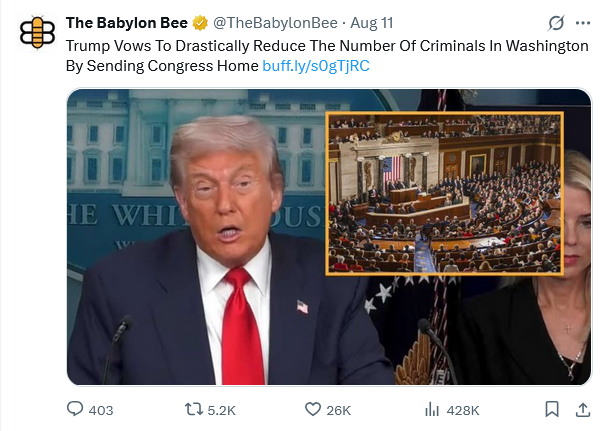Sources within the Trump administration cited data from an internal study that indicated the absence of Congress would likely reduce crime in Washington by more than 50%, leading the president to take bold action by removing the city’s biggest and most dangerous criminals.