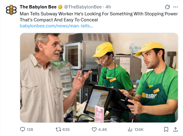 WASHINGTON, D.C. — An unidentified man at a local Subway location was seen asking the Sandwich Artist on duty if they had a sandwich that has good stopping power that’s also compact and easy to conceal.