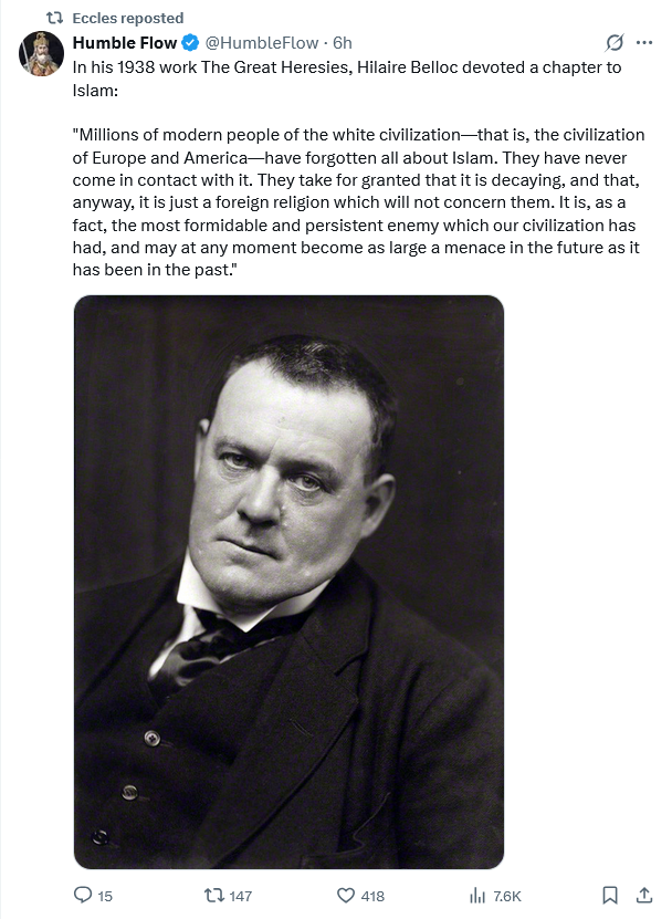 Belloc was very perceptive. Islam multiplies through their high birth rate. That’s what has happened through western immigration. It’s by design. And the idea that they rule by the sword has been replaced by rule through attrition. That’s how Islam is conquering the west.