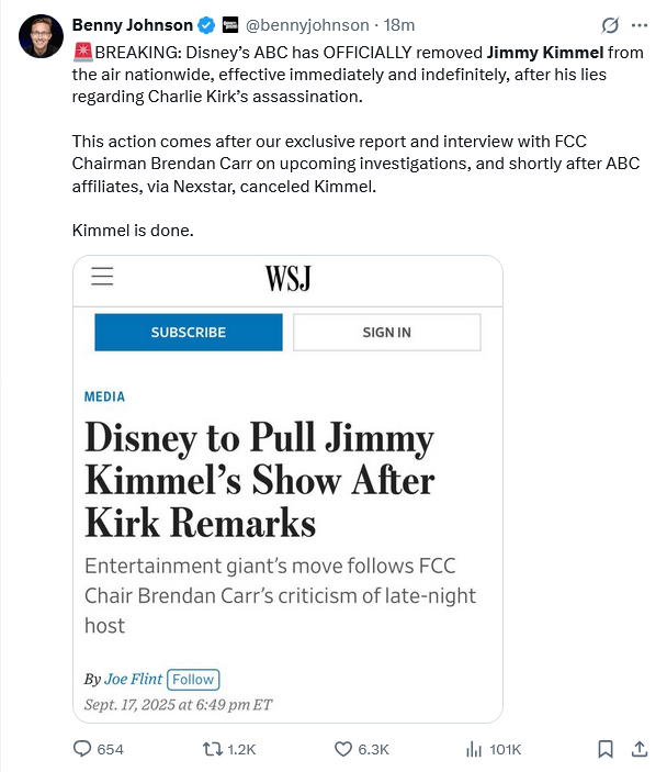 “Jimmy Kimmel pulled off-air following FCC threats.” USA Today”- suspension shocked his staff…” CNN