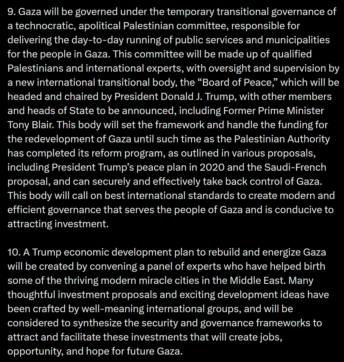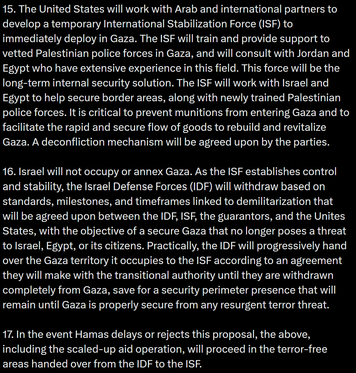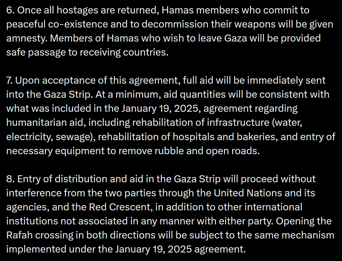 I thought it was ok until Point 6. Offering amnesty to Hamas if they surrender their weapons. A) they will never surrender their weapons and B) they are programmed terrorists who need to be deprogrammed before they are given freedom back into mainstream society.