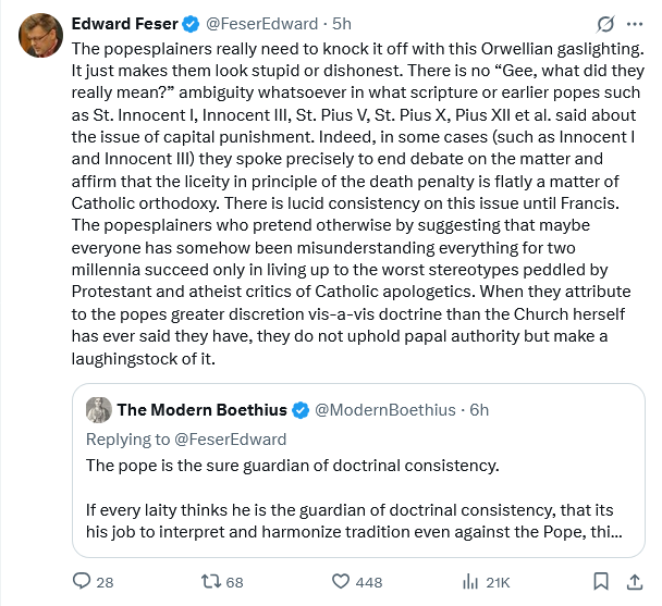 Like all the rest of us, Popes must be assumed to mean what they say. Honest liars are put to shame by the type of casuistry deployed when a pope says a foolish, factually challenged or mendacious statement, to argue that it can be parsed to make it orthodox. I had enough of that to last me a lifetime in the previous pontificate. The Pope is not a Mormon prophet who can pull new teaching out of his hind end whenever he feels like it. That has never been Catholicism.