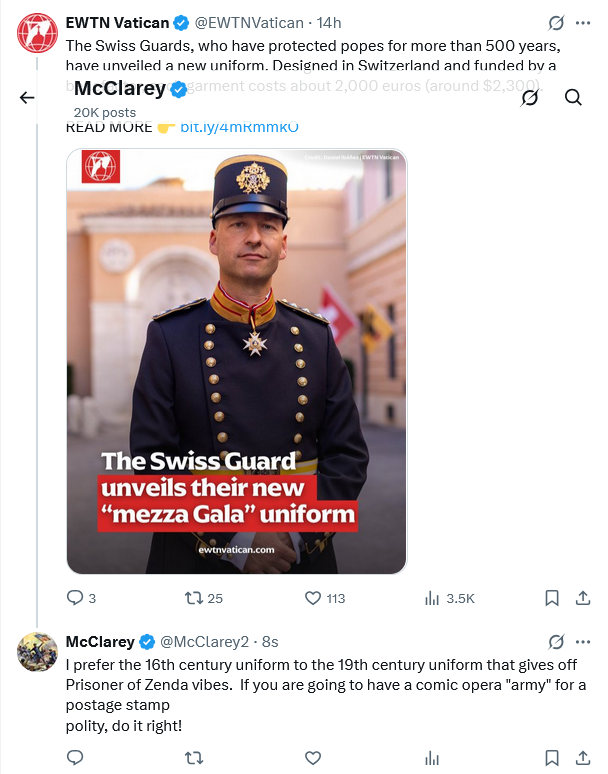Didn’t President Nixon have White House guards in an operetta uniform similar to the new Swiss guard uniform. It didn’t last long. I’m hoping the new Vatican uniform does not last either. No tradition connected to this new one. I’m thinking of the Beefeaters who guard the Tower of London and the King’s Guards at Buckingham Palace. These are all military units who are up to date with modern arms.