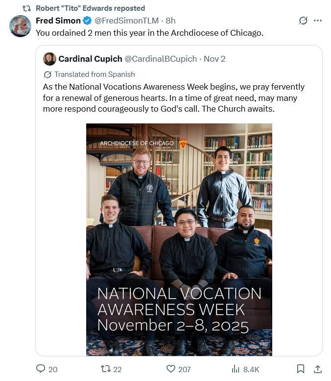 To underscore just how miserably Cardinal Cupich is performing at his job of attracting seminarians, his archdiocese has a Catholic population slightly over 16 1/2 times the size of Peoria’s. If +Cupich was drawing in vocations at Peoria’s rate, instead of having just two ordinations this year Chicago should be seeing 16.5 x 3, or *fifty* new priests instead of his paltry *two*.