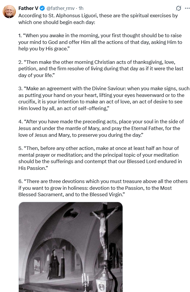After 1965, most of these kinds of valuable highly worthwhile spiritual exercises were scorned as “Pelagian,” mere “man-made efforts” at personal salvation. They were not: these daily spiritual exercises (“points”) were guideposts developed by consummate masters of the spiritual life: besides S. Alphonsus, S. Ignatius Loyola, S. Teresa of Avila, S. Francis de Sales, S. Peter of Alcantara, Francisco de Osuna, and others.