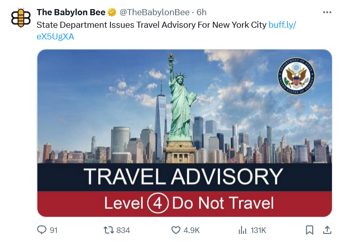 WASHINGTON, D.C. — Following the city’s election of an avowed and unrepentant socialist, the U.S. State Department issued an immediate and urgent travel advisory for New York City.