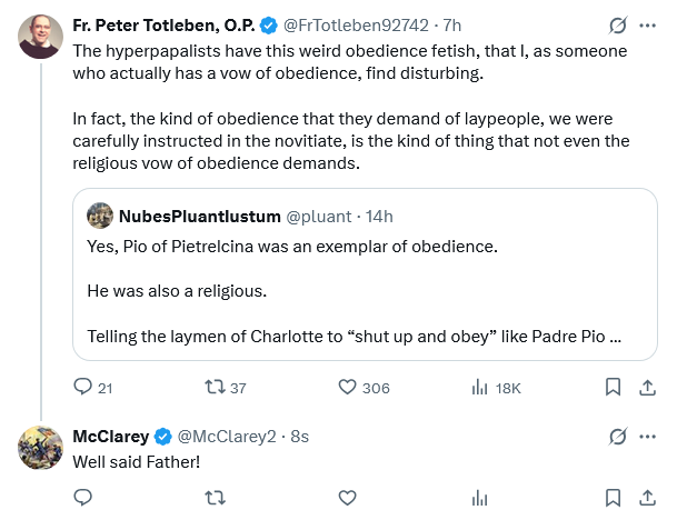 I think the looser obedience demanded of the laity is why (St) Fulton Sheen said that the laity would be the ones saving the Church, instead of the clergy.