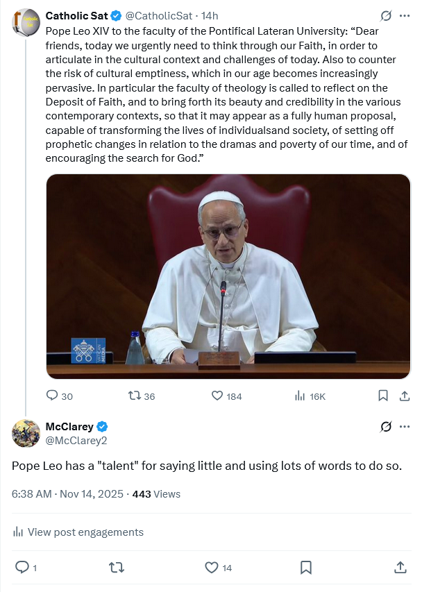 P.S.: I like Pope Leo too, on as personal a level as is possible with someone I’ve never actually met. He is a welcome change from his, er, difficult predecessor, and I would love to have him over for dinner and a White Sox baseball game on TV. But he’s a committed Modernist, with all that entails, so I pray daily for his conversion of heart.