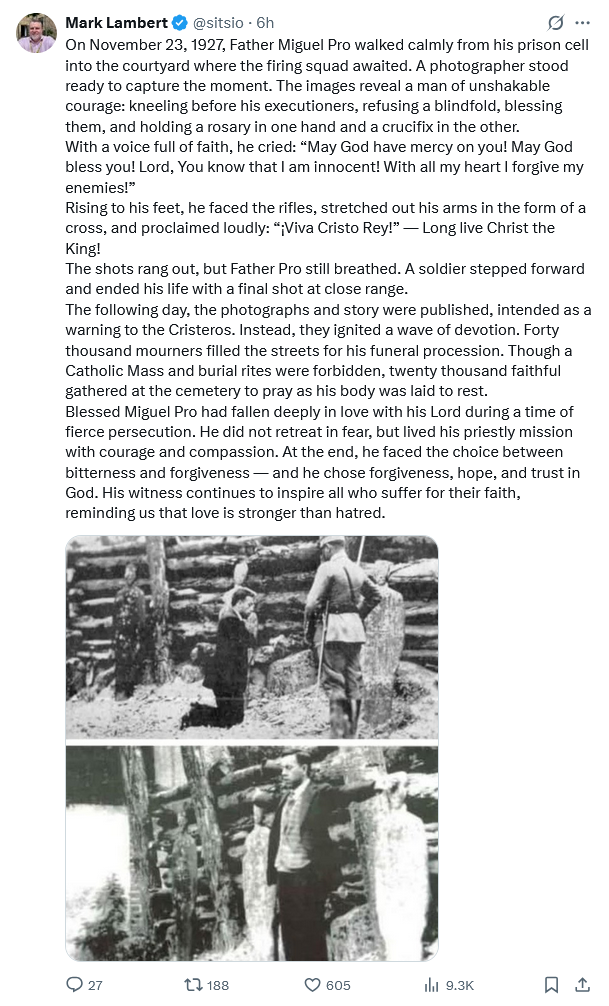 I have long loved and admired my good Blessed Miguel Pro. He is of the generation of truly noble Jesuits, which includes Fr. Willie Doyle, SJ, whose cause is being investigated presently. They joyfully – *truly* joyfully – brought Jesus to those who suffered with no thought of their personal comfort, and in the face of mortal danger.