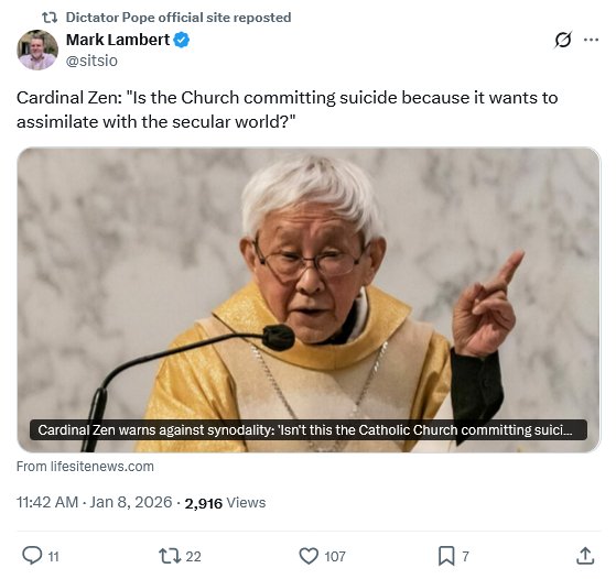 Personally, I don’t care if the Institutional Church implodes from this cancerous infestation and infection of liberal progressive modernism. God will preserve 7000 who have NOT bent knee to Baal, who have NOT kissed that demon god. Francis II – er, I mean Prevost – knows that and should be in fear and trembling at the responsibility on his neck to do the righteous thing.