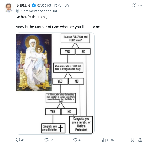 Protestants get confused. On the one hand they think that the mother creates the baby, so if Mary is the mother of God, then they suppose she created God, which would make her greater than God and that’s idolatry. Thus, I explain to them that even a mother of a person like you and me doesn’t create us; God does by creating our soul, infusing it into the embryo at conception inside a mother’s body, and making all the biochemistry to work (after all, He wrote the DNA software code to make this happen). They get that, especially Young Earth Creationists who believe in Intelligent Design. Then I tell them that that’s how Mary is God’s Mother. Same thing. God became incarnate inside Mary, made all that DNA biochemistry to work, and She bore Him as the Ark of the New Covenant, so she’s the Mother of God. But they promptly say idolatry. Even when I tell them that Protestant Reformers like John Calvin and Martin Luther recognized Mary as the Mother of God. But they can’t accept that, even the great late Dr. John MacArthur. It’s astounding. To them, being a mother makes her greater than her son. But was Bathsheba greater than Solomon? No. Equally, Mary isn’t greater than Jesus, but Jesus is still God and She’s still His Mother. Evangelicalism and Pentecostalism have stupidified Protestantism.