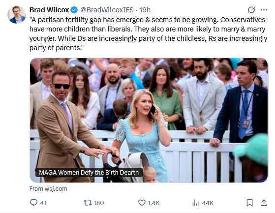 Not having children also frees up the left from having to consider the long-term consequences of their policies. “What sort of a society are we leaving to our children?” isn’t a concern for people with no skin in that game.