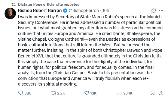 I don’t think Vance is a Buchananite, who believes we can go on as if the rest of the world doesn’t exist. He strikes me as many a working-class conservative (like me) who gets tired of the snottiness of the Europhile left and neocon right about America’s role in the world taking precedence over its role to Americans: to their security and their prosperity first. I’ll be a good neighbor because I need good neighbors (in part because of the inevitable bad neighbors), but my family comes first. Rubio’s vision is a little wider than Vance’s, but they seem more along a continuum. I think Vance casts a wider eye than his often gruff language betrays.