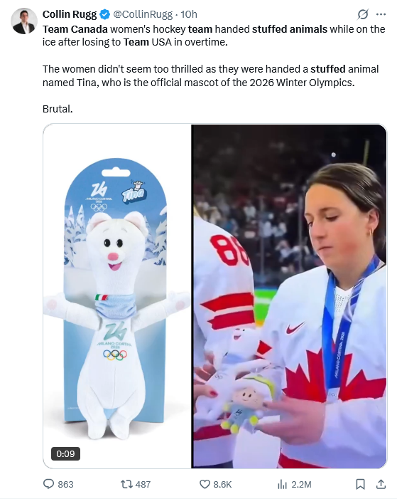 I have zip interest in sports, but I have a lot of interest in this country. (Although I did attend hockey games at the U of I during my law school days. The cold stadium was nice on a hot day and the brawls that would break out were entertaining.) If Canada loses will they be given a stuffed animal as the Canadian women were after they lost the gold to Team USA?