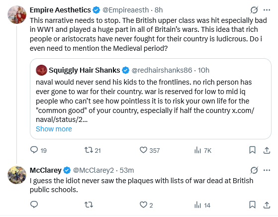 There is a monument to Peers and sons of Peers killed in WWI in the corridor outside the British House of Lords chamber, memorializing the bloodletting. Despite “Squiggly Hair Shank’s” lazy assertion, a few minutes spent with Google reveals that British peers and their sons were killed at a rate almost double that of regular enlisted. Over 10,000 nobles served, and between 20-25% were killed in action.
