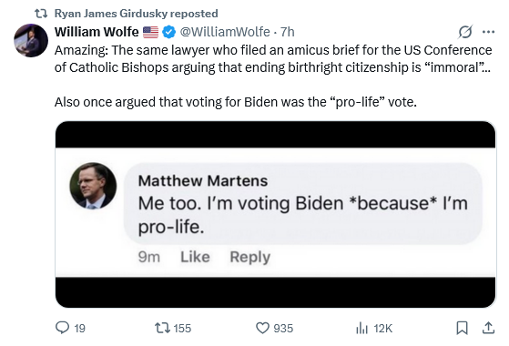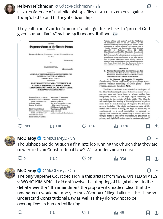 The second part is the defense from Catholic teaching. This is the part that is not really an argument. There main idea cited is that all humans have inherent dignity, which is definitely true and the teaching of the Church. But this is never really connected to birthright citizenship. There are some statements that just assert a relationship without explaining it (ex. “Birthright citizenship accords with the Church’s teachings concerning the State’s obligation to uphold and protect human dignity because it treats birth within a community as a sufficient and objective basis for political belonging.” But why does defining “political belonging” by birth specifically have anything to do with one’s dignity?) In this case, the very next sentence contradicts the claim: “The Church teaches that equal human dignity is inherent in the mere fact of personhood and does not depend on citizenship, immigration status, or parentage. ” (But if that is the case, it would follow that not being a citizen does not remove the inherent dignity of a person.) Similarly there is a long discussion of what subsidiarity means (an actual good and something advocated for by Church teaching) but barely any attempt to say that Birthright citizenship is necessary for promoting subsidiarity.